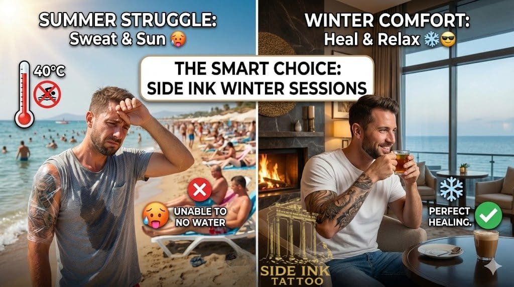 Der Winter-Vorteil: Vergiss den Stress im Sommer. Große Projekte (Wie Full-Sleeves, Japanische Rücken-Tattoos oder Realismus) brauchen Ruhe.